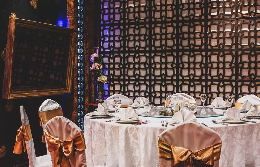 В интерьере используется симбиоз разных восточных стилей: стены украшают мягкие панели со встроенной шумоизоляцией, по центру установлена деревянная панель с орнаментом, мягкая мебель обита вишневым бархатом, а потолочное освещение оснащено яркой неоновой подсветкой. Зал подойдет для проведения камерных мероприятий.