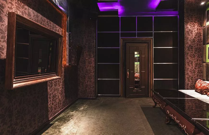 Стены декорированы по принципу мозаики – квадратные панели со встроенной шумоизоляцией сменяются изображениями с китайскими иероглифами, мягкая мебель облачена в красочную обивку, а потолок подсвечивается ярким неоном.