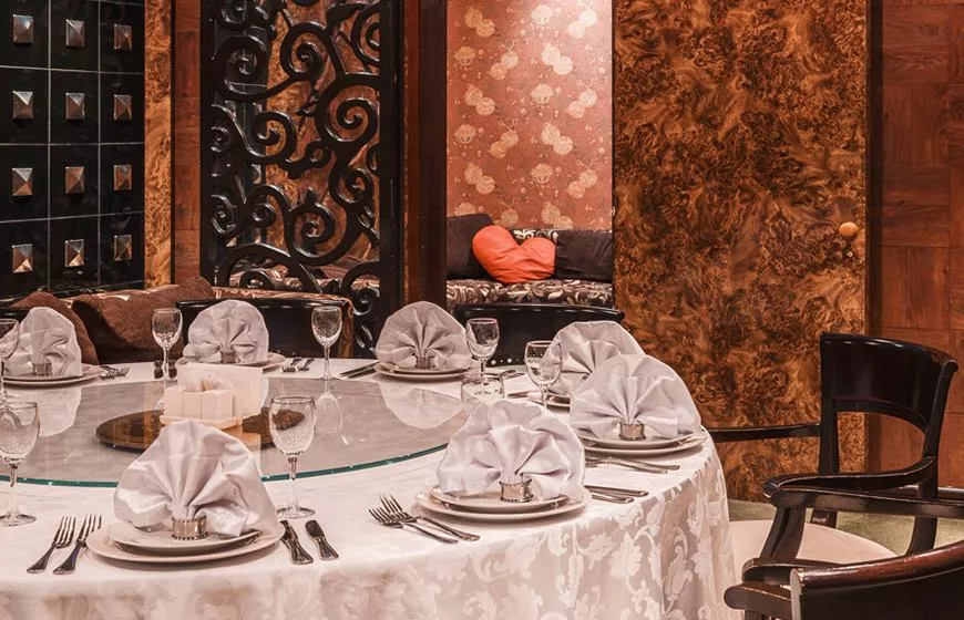 Камерный зал «Сириус 3» в гостинице Космос ВДНХ выдержан в классическом восточном стиле, но с долей европейского лоска. Оформление каждой стены уникально: одну украшает деревянная панель с витиеватым узором, другую – обои с набивным рисунком.