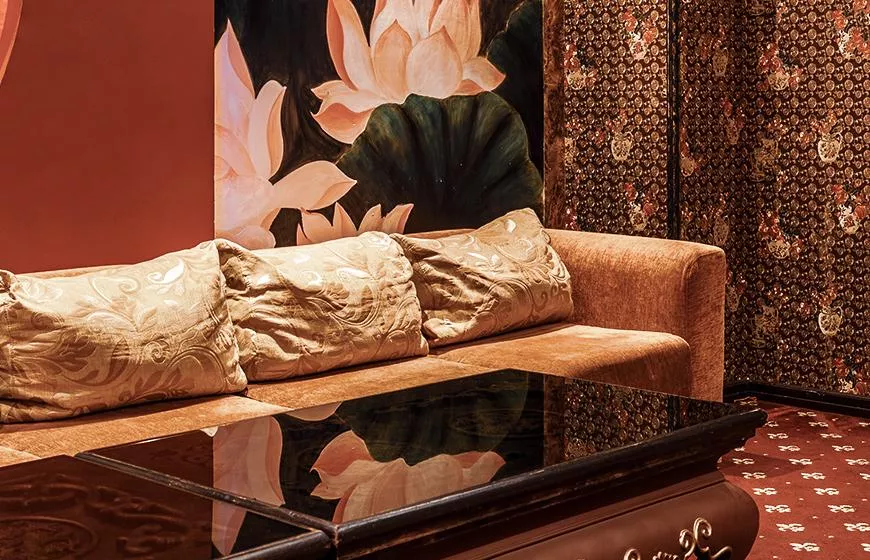 Ведущий цвет в интерьере – красный. Стены украшает деревянная панель, на которой высечены китайские иероглифы, а также фотообои с изображением белых лотосов, в обивке мебели использован бархат золотистого оттенка. Зал подойдет для проведения мероприятий в узком круге друзей или семьи.\r\n