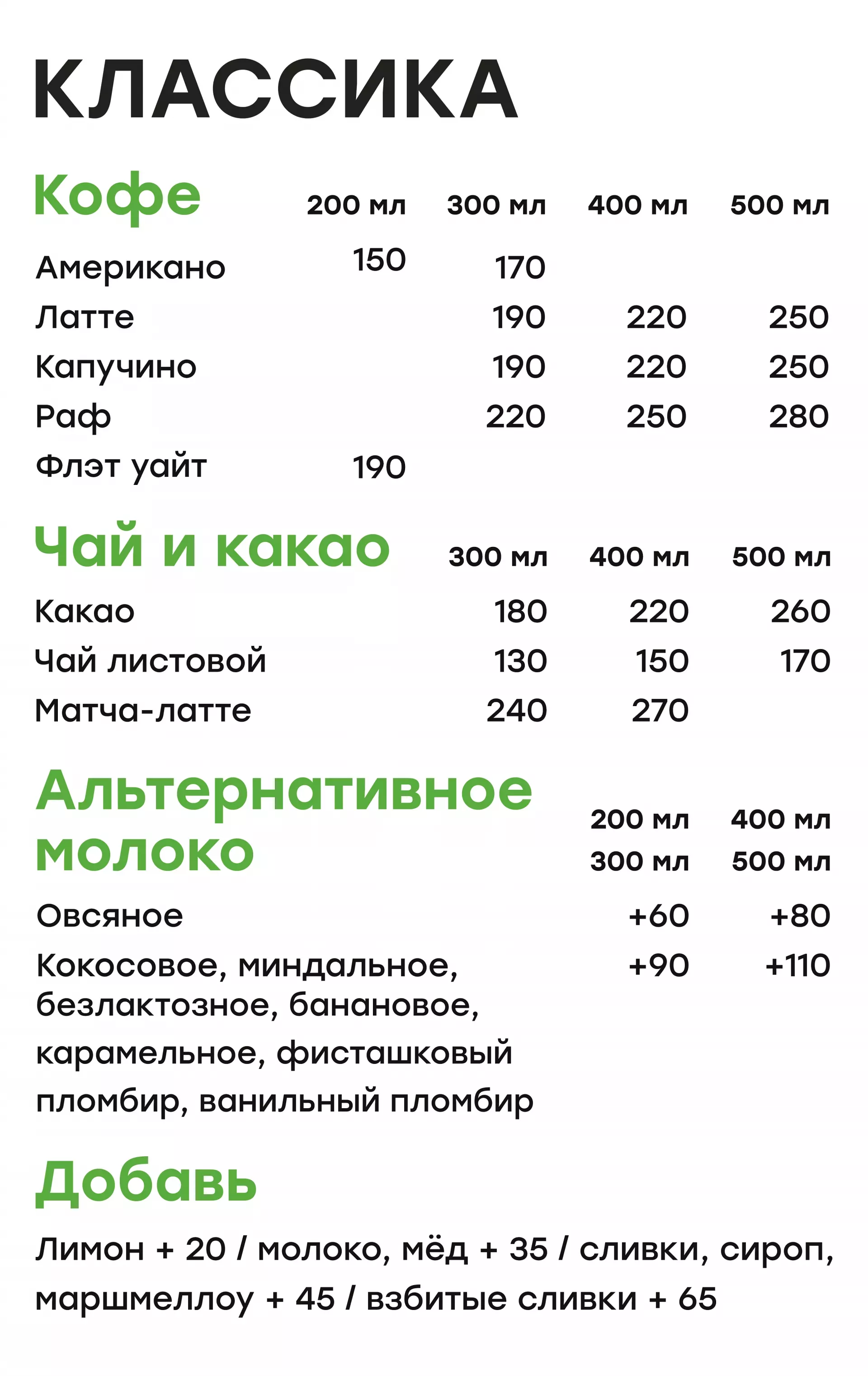 Так же в нашем меню доступен широкий ассортимент завтраков и горячих блюд, свежей выпечки и кондитерских изделий ручной работы.